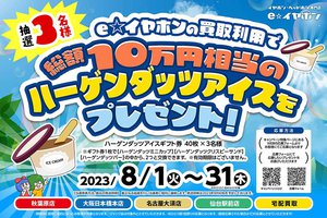 イヤホン・ヘッドホン専門店のe☆イヤホンは、買取サービスの利用者を対象に、抽選で総額10万円相当のハーゲンダッツアイスギフト券をプレゼントするキャンペーンを明日8月1日(火)より実施する。期間は8月31日(木)まで。