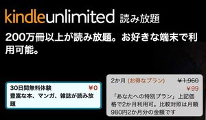 表示されたら対象!Amazonの読み放題が2ヶ月99円の「Kindle Unlimited」キャンペーン