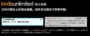 コミックや雑誌、書籍が読み放題となるKindle Unlimitedは、通常なら1ヶ月980円、3ヶ月で2,940円が必要になるが、本キャンペーンで加入すれば最初の3ヶ月を99円で利用可能だ。