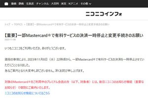 ニコニコは、一部Mastercardでの有料サービスの決済を11月8日22時頃より一時停止した。