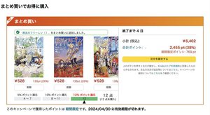 ということで、まとめ買いキャンペーンで『フリーレン』全巻(通常版)を買ってみると、合計金額6,402円なのに対し、なんと38%にあたる2,455ポイントが還元される結果となった。およそ4冊分以上が実質タダになる計算だ。
