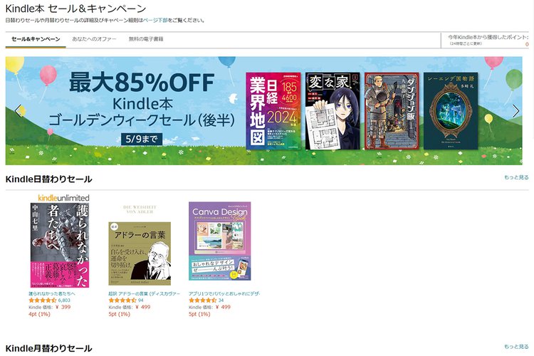 Amazonは、電子書籍が最大85%で購入できるゴールデンウィークセールや、最大30%オフのマンガ全巻まとめ買いセールを実施している。セール期間はどちらも5月9日23時59分まで。
