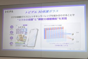 トビデル 3D保護ガラスは、通常の保護ガラスに「レンチキュラーレンズ」を組み合わせた製品。従来あった画面の保護や防汚・防指紋機能に加え、裸眼で3D視聴ができる機能が追加されている。