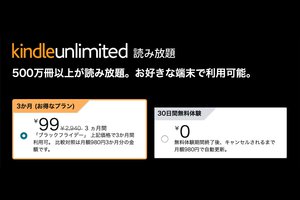 Amazonは、ブラックフライデーセールの開催にあわせ、およそ500万冊以上の電子書籍が読み放題になるサービス 「Kindle Unlimited」を3か月99円で利用できるキャンペーンを実施中。