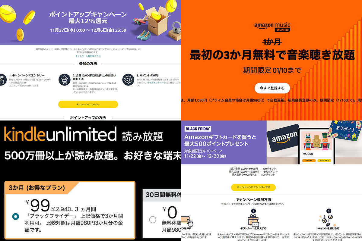 サブスクリプションサービス系では、Kindle UnlimitedとAudibleという読書系はブラックフライデーと同時にキャンペーンが終了。Amazon Music Unlimitedのキャンペーンは年明け1月10日までキャンペーンが続く。いずれのサービスも無料/99円期間中に契約をキャンセルすることも可能なのでこうした機会に体験してみるのもよいのではないだろうか。