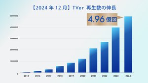 民放公式テレビ配信サービス「TVer(ティーバー)」は、2024年12月の月間動画再生数を発表。再生数は約4.96億回を突破し、パリ五輪が開催された2024年8月を超えて過去最高記録を更新したことを明らかにした。