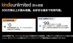 Amazonは、500万冊以上の電子書籍が読み放題になるサービス 「Kindle Unlimited」を2か月99円で利用できるキャンペーンを実施している。キャンペーンが表示された方のみ対象だ。