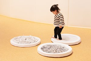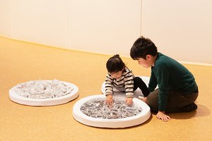 常設あそび「音皿」は、新聞紙やアルミシート、ビニールなど7つの素材を敷き詰めた、子ども一人が入れる大きさの「音皿」を作り、その音皿の中で「シャカシャカ」「カタカタ」といった様々な音を全身で体感することが可能。0歳〜2歳が対象となっており、赤ちゃんも楽しめる “音あそび” として展開している。