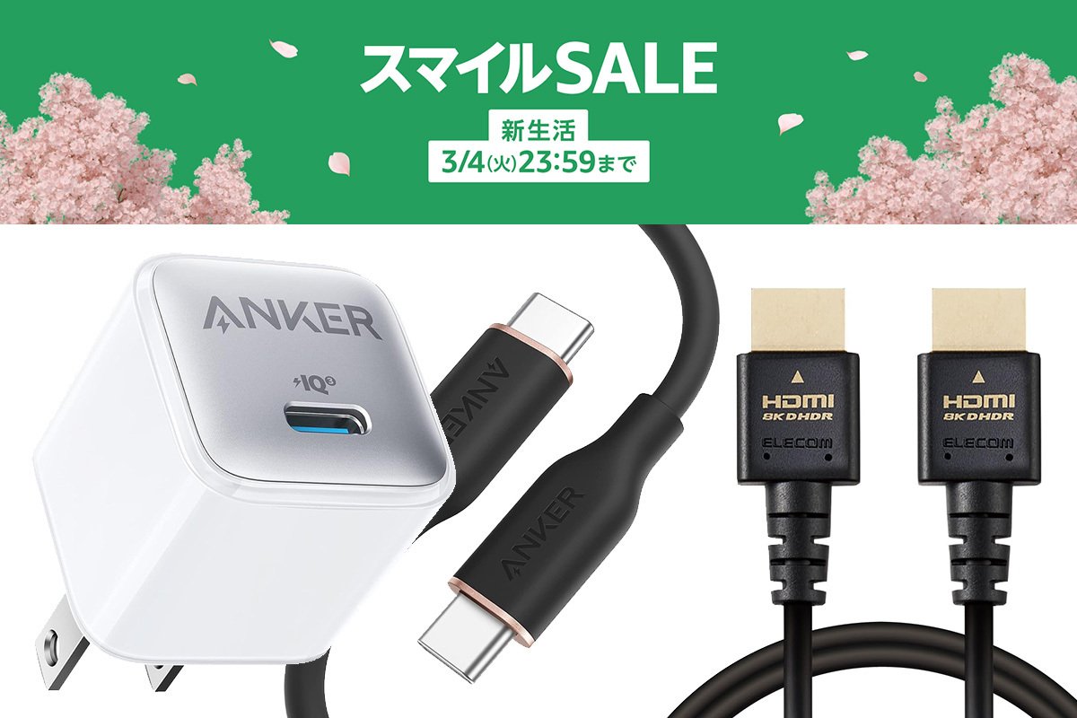 例えばAnkerのUSB PD対応USB-C急速充電器「Anker Nano Charger (20W)」は21%オフの1,340円で購入可能。同じくAnkerからは、出力100WのUSB PDに対応するUSB Type-Cケーブル「PowerLine III Flow USB-C & USB-C ケーブル」も25%オフの1,340円になるなどしている。
