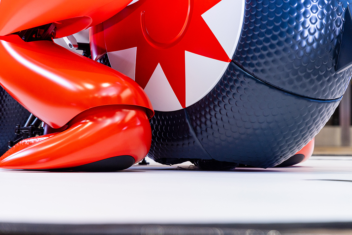 Hondaらしさを表現するため、先進技術研究所がもつ先進バランス技術を導入。人が乗っていても乗らなくても、浮き輪部分だけで自立できることを目標としている。また手足に関してはASIMOで培った技術を採用しているとのこと。ちなみにトヨタのミライドンは四足歩行が可能だが、Hondaは基本的に2輪で走行。その走行に合わせて手足が動くようにするという。