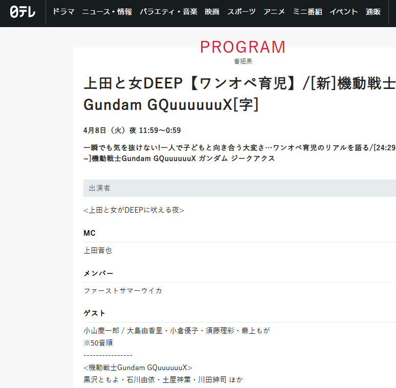 ※追記(4/8 17:30)日本テレビ番組表更新をチェックしたところ、次週4月15日放送分についても「上田と女DEEP【自律神経の乱れ】」との合体枠であることを確認。以降の放送についてもこの形を取り続けることが予想される。