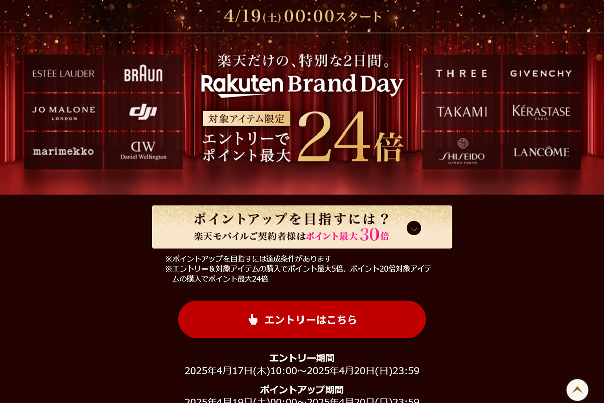楽天市場は、対象ブランドのアイテムがポイント最大24倍になる大型セール「楽天ブランドデー」を実施している。セール期間は明日4月20日23時59分までの2日間。