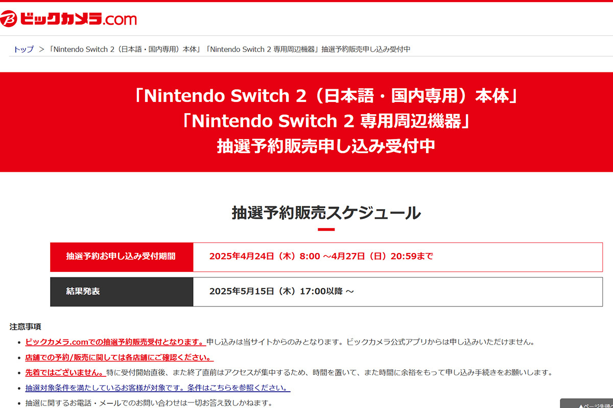 Switch 2、ビックカメラ.comが抽選販売を受付開始。提携クレカ必要なし、店舗とは異なる条件