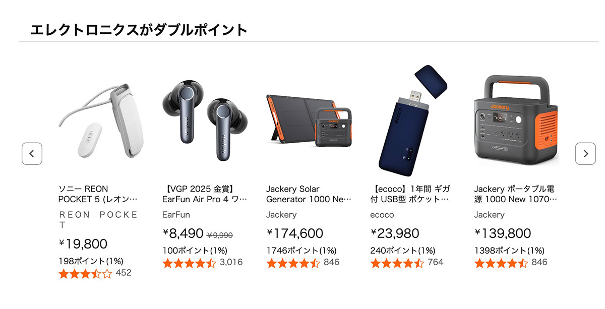 そのほかソニーの「REON POCKET 5」、Earfunの「Air Pro 4」、Jackeryのポータブル電源、NECの整備済みノートPC、Shokzのながら聴きイヤホン、CMF by NOTHINGのスマートウォッチなど、多彩なエレクトロニクス商品がダブルポイントの対象になっている。