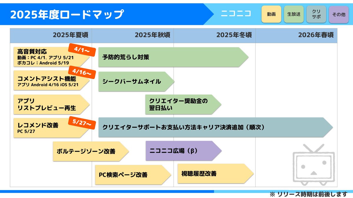 アップデートの一部は、すでにロードマップ公開に先駆けて展開中。例えばニコニコ動画では、4月1日から動画の高音質対応を順次進めており、プレミアム会員は最高576kbps、一般会員は最高192kbpsの音声ビットレートで動画を楽しめるようになる。