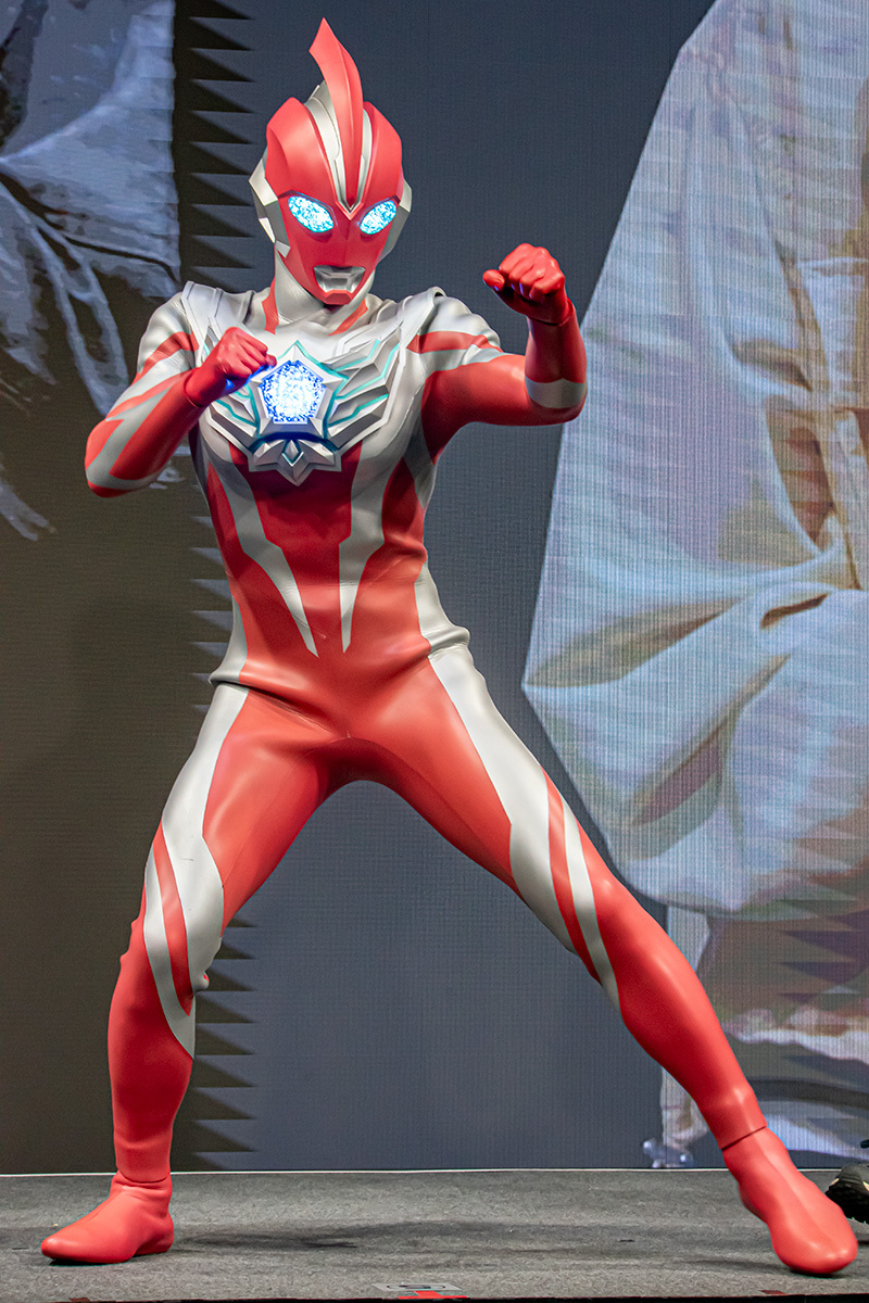 作品の見所とともに「『ウルトラセブン』のカプセル怪獣をイメージした」と武居監督が語る、メテオカイジュウが劇中さながらの吉田の呼び込みにより登場。序盤よりウルトラマンオメガをサポートするレキネスとトライガロンの2体がステージに登場。こちらも世界初の公開となっており、記者の背中越しにファンの熱気と視線をありありと感じた。