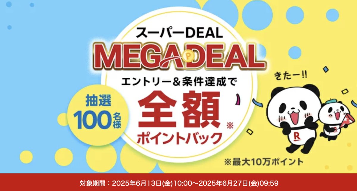 楽天市場では、楽天会員を対象とした「楽天スーパーDEAL」にあわせて、最大で購入金額の全額がポイントバックされるキャンペーン「メガDEAL」を開催中。キャンペーン期間は6月27日(金)9時59分まで。なおキャンペーンの利用には事前エントリーが必要。キャンペーンページ内のボタンをクリックすることでエントリーできる。