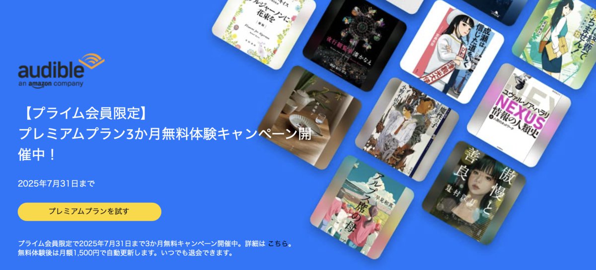 Amazonは、プライム会員を対象に、オーディオブックサービス「Audible」のプレミアムプランが3ヶ月無料で体験できるキャンペーンを実施している。期間は7月31日(木)23時59分まで。
