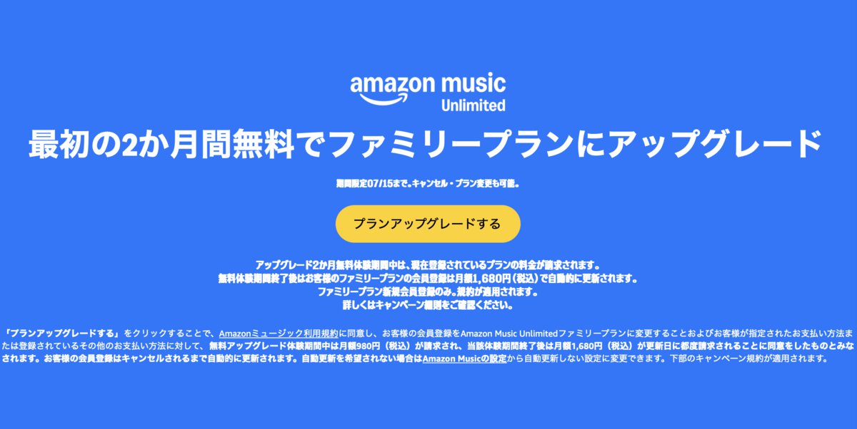 ファミリープランは、1つのアカウントでも最大6台までのデバイスで同時に音楽を再生できるプラン。今回のキャンペーンは、Amazon Music Unlimited(個人プラン月額)に登録中のユーザーがファミリープランに新規移行する場合が対象となる。