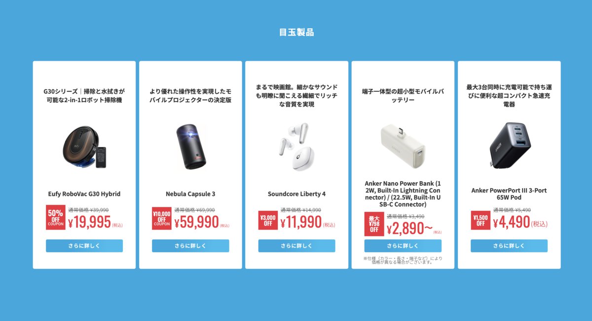 Ankerは楽天市場の公式ショップにて、対象製品が最大50%で購入できる期間限定セールを実施中。期間は8月11日(月) 午前1時59分までとなっている。