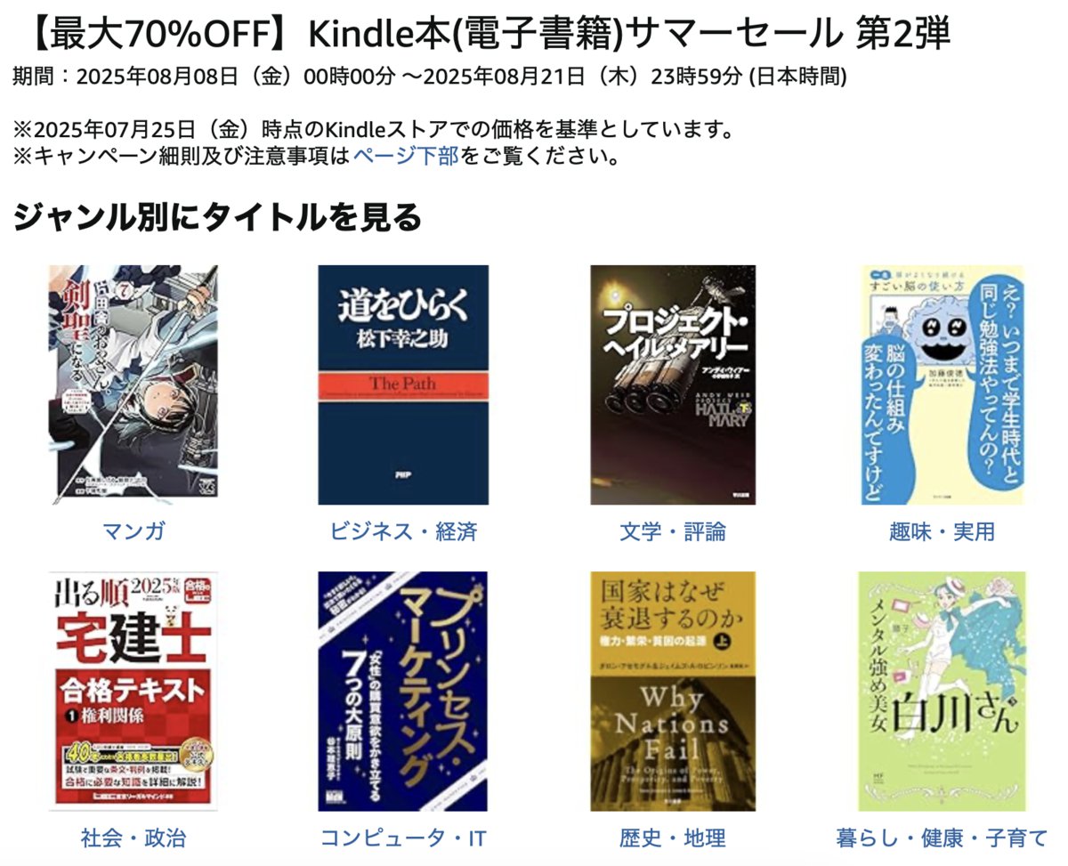 Amazonは、対象のKindle本が最大70%オフになる「Kindle本サマーセール 第2弾」を本日8月8日 0時からスタートしている。期間は8月21日(木)23時59分まで。