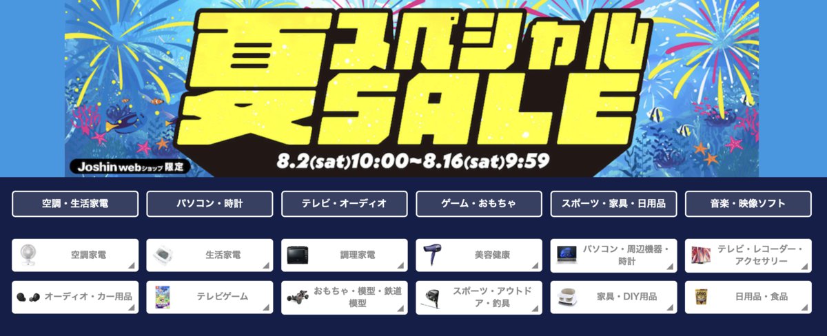 Joshin webショップは、AV機器をはじめ様々な製品がセール特価になる「夏のスペシャルセール」を、8月16日(土)9時59分まで開催している。