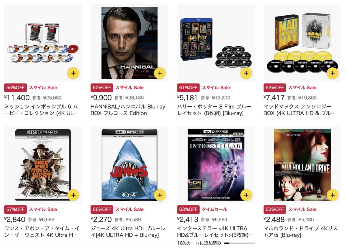 映画作品では、BDの『ジョーズ』は66%オフの2,270円に、『ハリー・ポッター 8-Film ブルーレイセット』は61%オフの5,181円で販売中。そのほかにも『ハンニバル Blu-ray-BOX』が62%オフの1万円切り、『マッドマックス アンソロジーBOX』は63%オフの7,417円でラインナップされている。