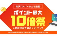 Amazonは、期間中1万円以上の買い物をすることで最大10%ポイントアップするキャンペーンを開催中。キャンペーンの参加にはエントリーが必要だが、特設ページにあるボタンをクリックするだけで完了する。期間は9月14日(日)23時59分まで。