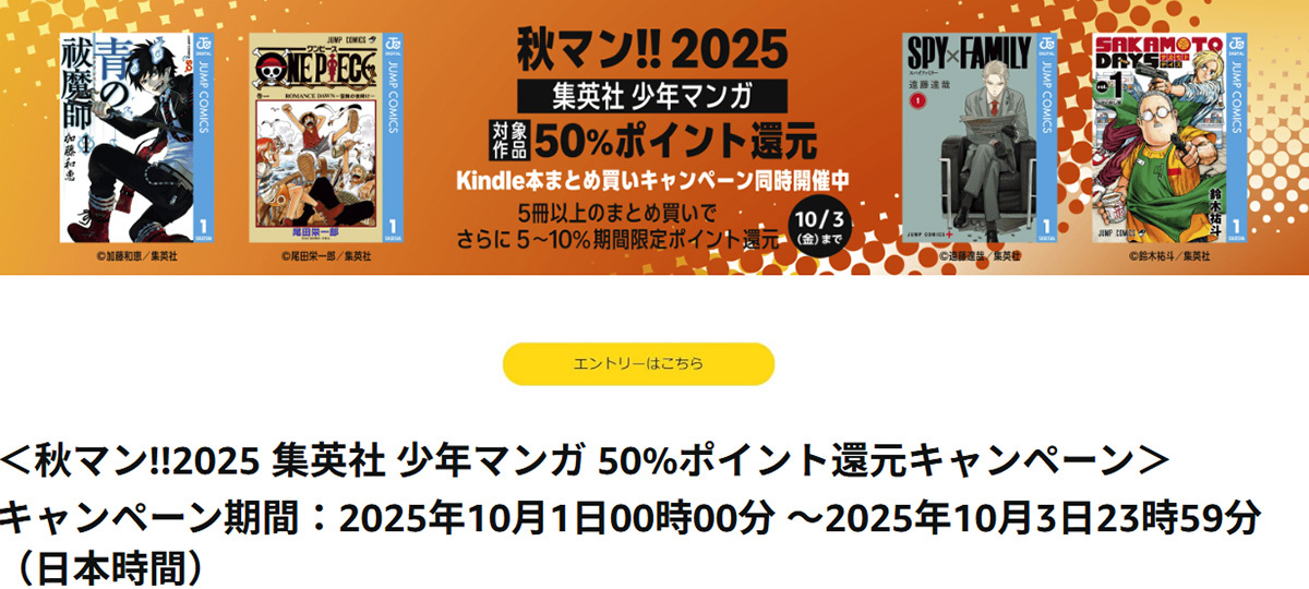 Amazonは、『鬼滅の刃』『ONE PIECE』などの集英社の人気マンガ作品が実質半額で購入できる「秋マン!!2025 集英社 少年マンガ 50%ポイント還元キャンペーン」を開始した。キャンペーン期間は10月3日 23時59分までの3日間限定。