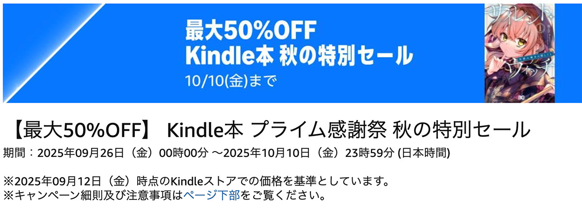HOME > ニュース > Amazon、Kindle本 最大半額キャンペーン中。『異世界おじさん』『失敗の科学』など人気作多数 ポイント還元ではなくて価格から割引 Amazon、Kindle本 最大半額キャンペーン中。『異世界おじさん』『失敗の科学』など人気作多数 公開日 2025/10/02 13:00 PHILE WEB編集部 Amazonは、『異世界おじさん』『失敗の科学』などの人気マンガ作品やビジネス書などが最大半額で購入できる「【最大50%OFF】 Kindle本 プライム感謝祭 秋の特別セール」を開始している。キャンペーン期間は10月10日23時59分まで。 Amazonで詳細を見る 対象作品をKindeleストアの電子書籍で購入すると、最大半額で購入できる。加えて「Kindle本 (電子書籍) まとめ買いキャンペーン」も10月9日 23時59分まで開催しており、併用するとポイント還元が追加される。 上述した『異世界おじさん』『失敗の科学』のほか、『サイレントウィッチ』『三日間の幸福』『普通の子』など、多数のマンガや小説がキャンペーン対象。 Amazonで詳細を見る この記事をシェアする 関連リンク 【最大50%OFF】 Kindle本 プライム感謝祭 秋の特別セール トピック セール情報
