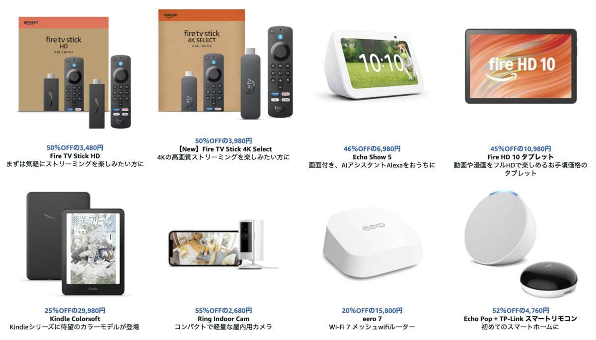 中でも、この秋新登場の「Fire TV Stick 4K Select」が50%オフの3,980円、「Fire HD 8 タブレット」も50%オフの7,990円に、そして「Echo Pop」はなんと60%オフの2,380円で出品されるようだ。特に、過去のセールではFire TV Stickシリーズで一時品切れになるモデルが出たこともあったので、狙っている物がある場合は早めにチェックしておいたほうがよいかもしれない。