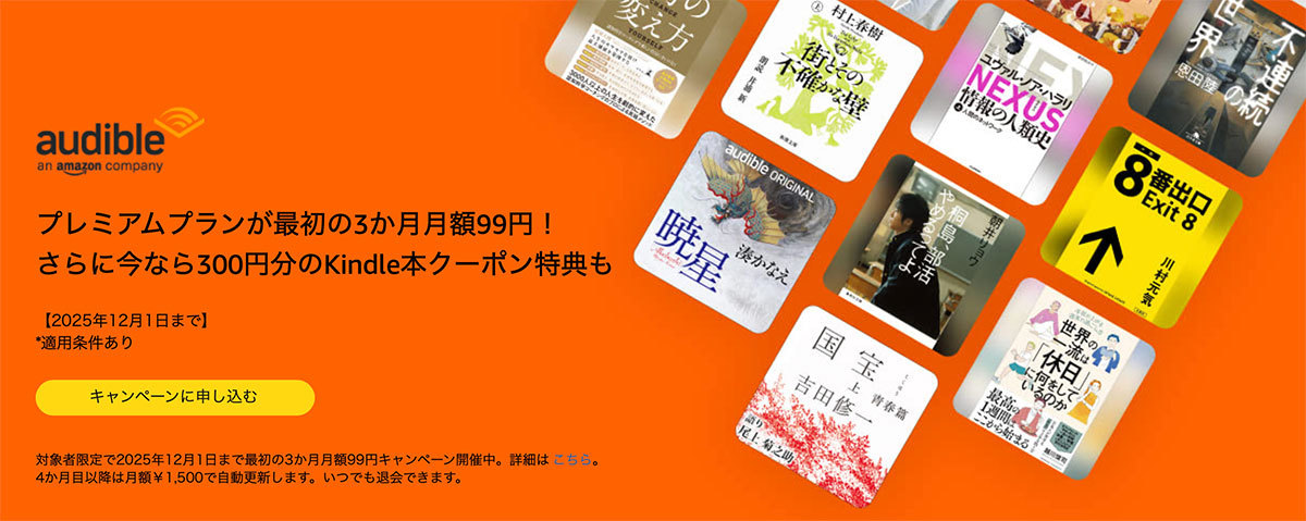 現在Amazonでは、オーディオブックサービス「Audible」を3ヶ月99円で利用でき、さらに300円分のKindle本の購入に使えるクーポンもプレゼントされるキャンペーンを実施中。期間は12月1日(月)までとなっている。