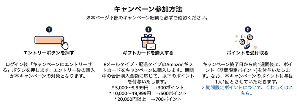 ポイント付与金額は、ギフトカード5,000〜9,999円購入で300ポイント、10,000〜19,999円 購入で500ポイント、20,000円以上購入で700ポイントとなっている。