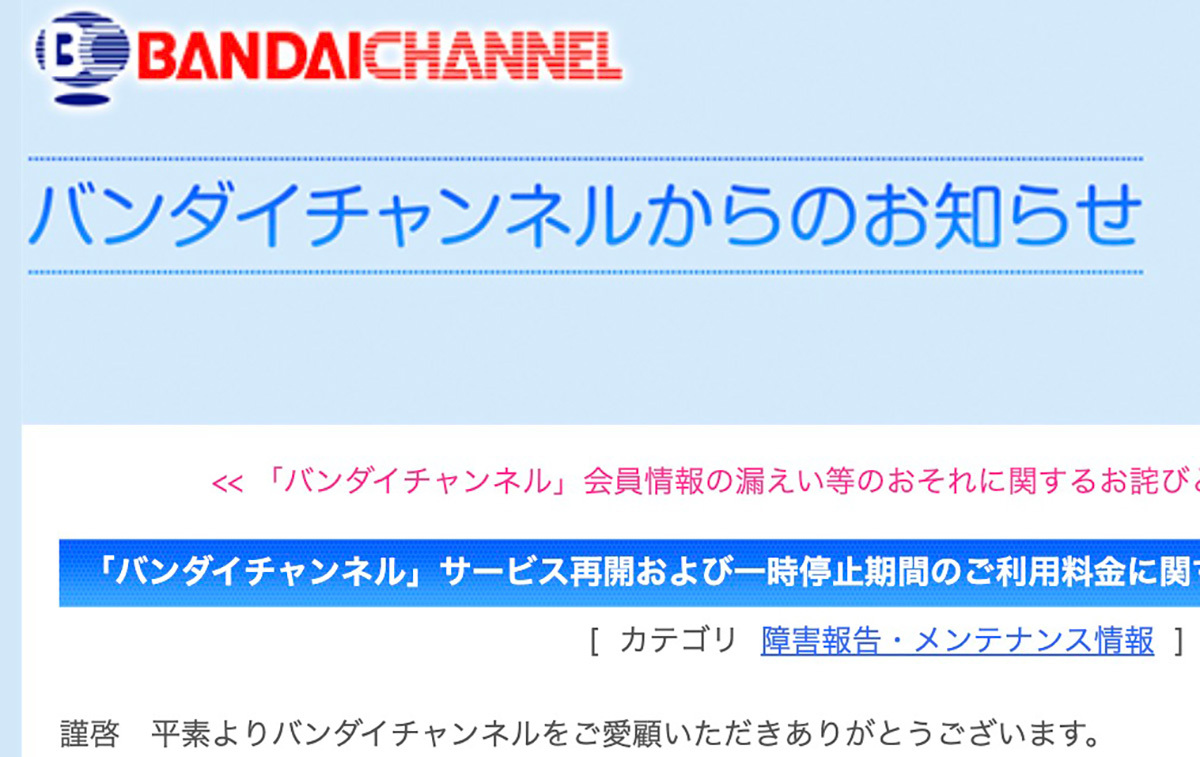 「バンダイチャンネル」サービス再開。不正アクセス疑いでの一時停止から復帰