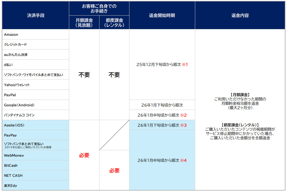 サービスを停止していた期間の利用料金については、月額有料会員には11月・12月分の未提供期間に応じて返金を実施。作品ごとの都度課金の利用分は、視聴期間が停止期間にかかった場合に返金対象となる。