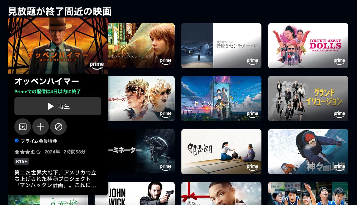 Amazon Prime Videoの「見放題が終了間近の映画」に、多数の有名作品や人気作品が掲載されている。中でも、昨年に公開された話題の映画作品「オッペンハイマー」は、4日以内に見放題配信が終了と書かれている(12月24日の記事執筆時点、以下同)。
