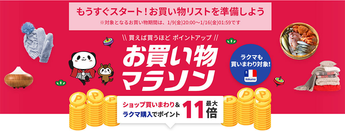 楽天お買い物マラソン、1/9 20時からスタート!最大半額の2時間限定クーポンも事前配布中