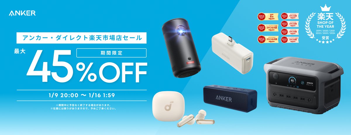 Ankerは楽天市場の公式ショップにて、対象製品が最大45%で購入できる期間限定セールを実施中。期間は1月16日(金) 午前1時59分までとなっている。