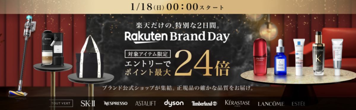楽天市場は、ポイントアップキャンペーン「楽天ブランドデー」を開催する。期間は2026年1月18日(日)0:00から1月19日(月)23:59までの2日間。