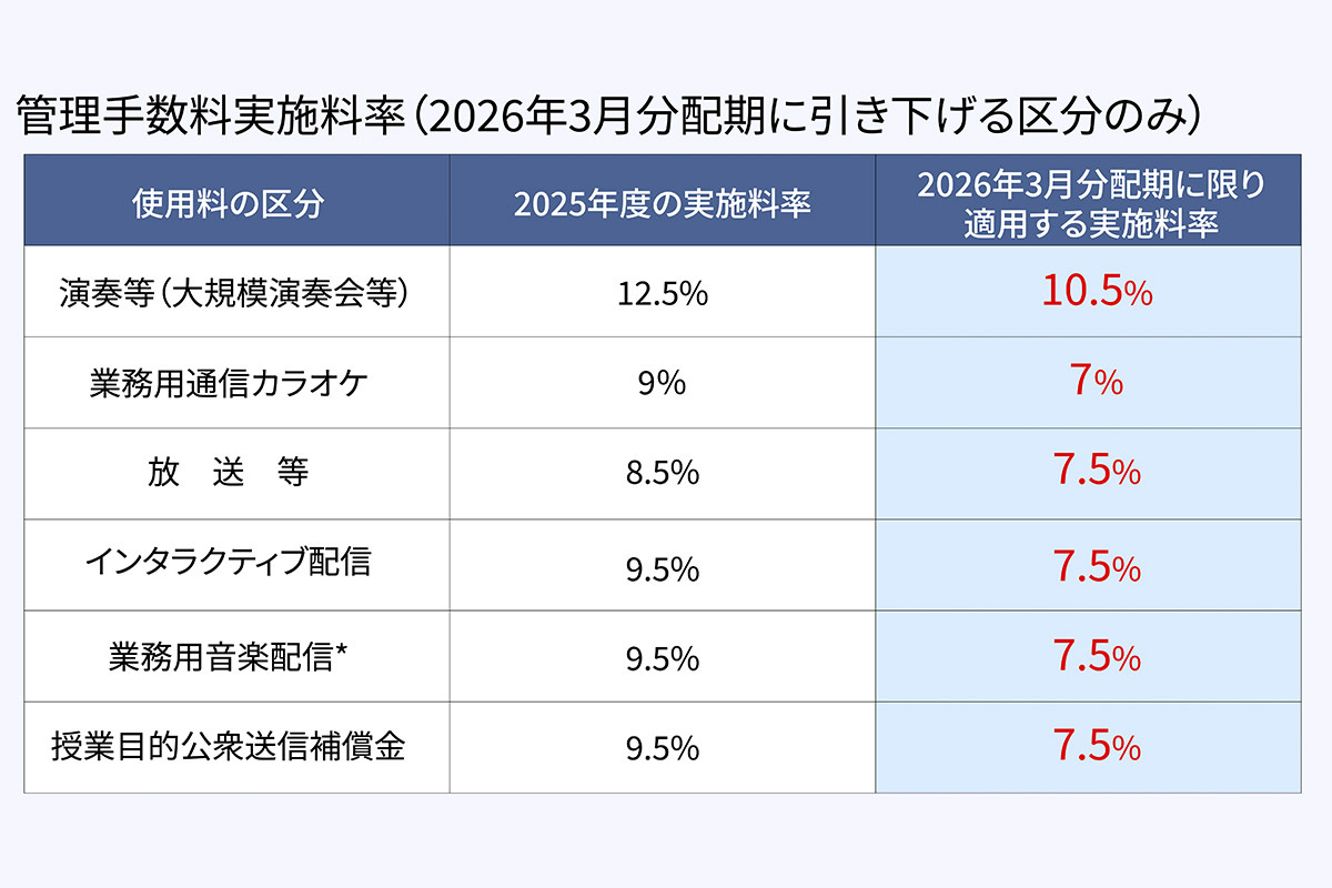 日本音楽著作権協会(JASRAC)は、2026年3月分配期における管理手数料実施料率の一部引き下げを発表。対象期間におけるアーティストへの支払い額が増額される。