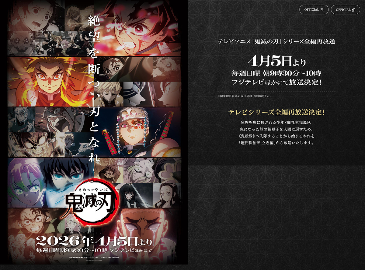 アニメ「鬼滅の刃」テレビシリーズが4月5日から全編再放送されることが決定。毎週日曜朝9時30分から10時にフジテレビほかにてオンエアされる。