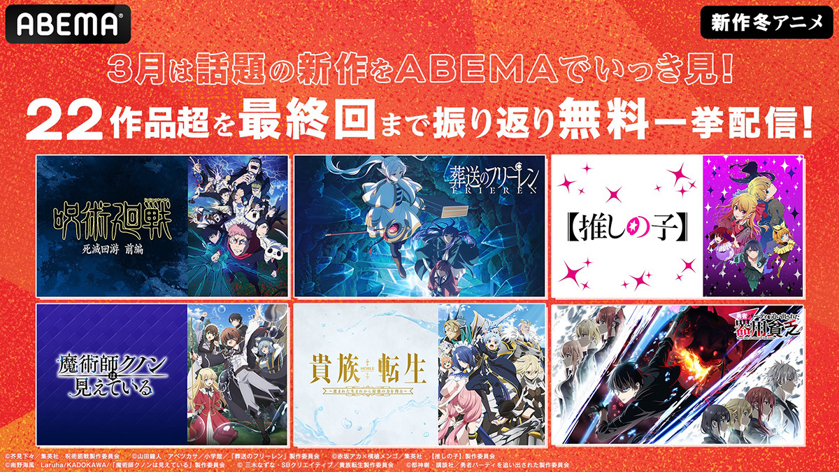 ABEMAは、新作冬アニメ22作品の全話無料一挙配信を3月31日まで実施している。