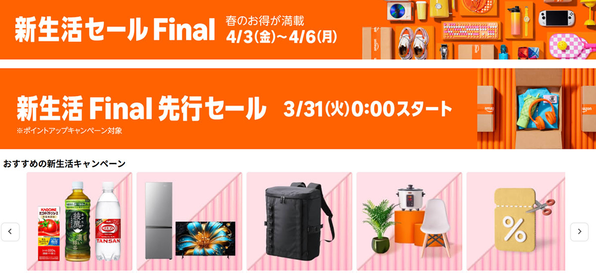 Amazonの「新生活セールFinal」が4月3日(金)から4月6日(月)まで実施されるが、それに先駆けて3月31日(火)0時からは「新生活セールFinal先行セール」が開催される。ここでは、新生活セールFinalと先行セールは何が違うのか? セール開始前におさらいしておきたい。
