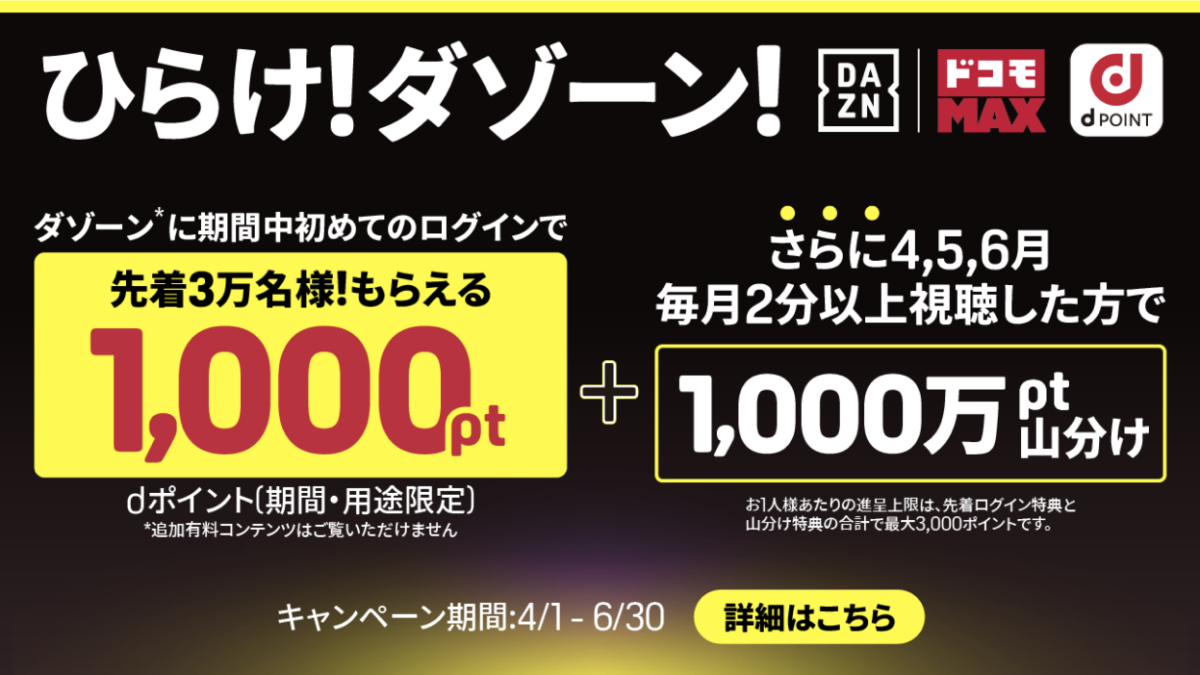 DAZNは、「ドコモ MAX」「ドコモ ポイ活 MAX」「DAZN for docomo」契約ユーザーを対象に、総額4,000万dポイントを進呈するキャンペーンを本日から6月30日(火)まで実施する。進呈されるのはdポイントの期間・用途限定ポイントで、利用開始や継続視聴のきっかけづくりを狙った施策として展開する。