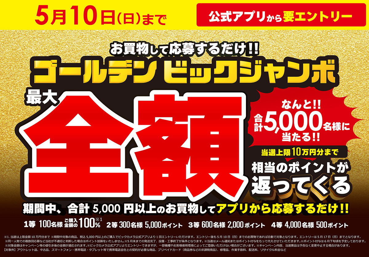 ビックカメラは、購入金額の最大全額がポイント還元されるキャンペーン「ゴールデンビックジャンボ」を4月18日から、ゴールデンウィーク期間を含む5月10日(日)まで開催する。