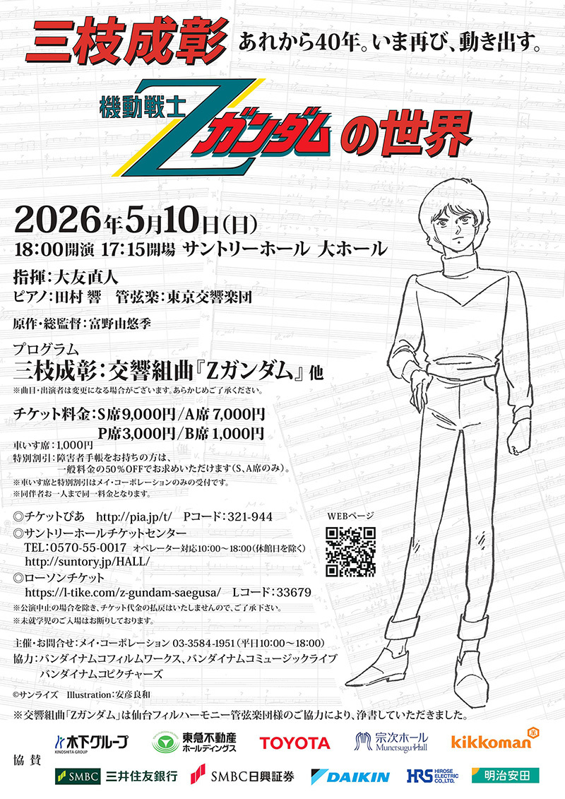 根強いファンを持つ “ガンダム” シリーズより、『機動戦士Zガンダム』を題材にした『三枝成彰 機動戦士Zガンダムの世界』のコンサートを5月10日(日)にサントリーホールで開催する。チケットの価格はS席が9,000円、A席が7,000円。