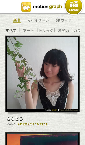アプリを起動するとまず作品紹介サイトが表示される。右上の「Create」ボタンをタッチすることで撮影画面に移行する。なお自分が過去に公開した作品は「マイイメージ」から閲覧可能
