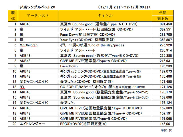 HOME > ニュース > ホビー&カルチャーニュース サウンドスキャンがレポート発表 2012年のCD売上は前年比2.6%増 − アーティスト別トップはミスチル ファイル・ウェブ編集部 2013年01月29日 前の写真へ シングルベスト20 前の写真へ この写真の記事へ 関連リンク サウンドスキャンジャパン