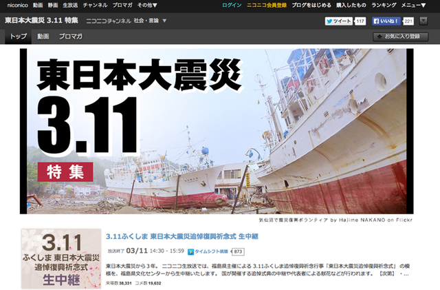 HOME > ニュース > ホビー&カルチャーニュース 関連動画の投稿募る ニコニコチャンネル内に「『東日本大震災 3.11特集』特設ページ」オープン ファイル・ウェブ編集部 2014年03月11日 「東日本大震災 3.11特集」特設ページ この写真の記事へ 関連リンク 「東日本大震災 3.11特集」特設ページ