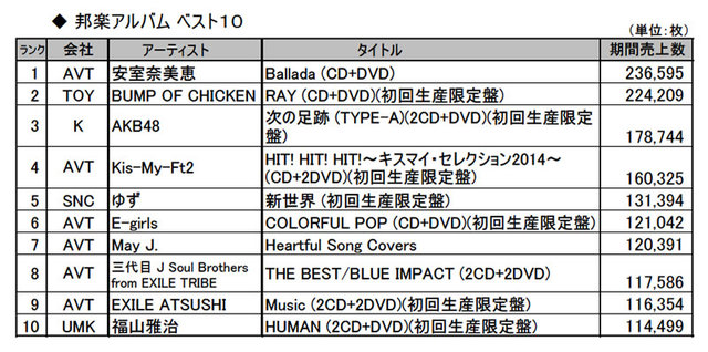 '14年上期CD売上、前年同期割れで1,000億円を切る − アーティストは嵐とAKBが首位争い
